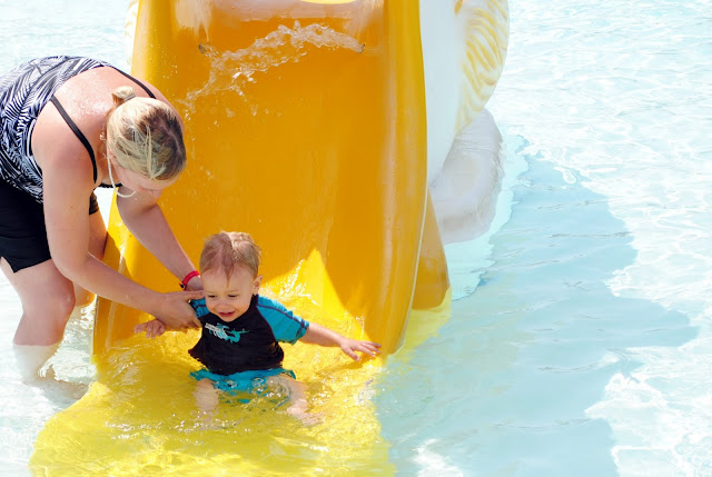 You can tell in the pictures that his lips are a little purple. It was pretty cold. The sun was out for awhile, but most of the day was overcast and the water was chilly. After warming up a little we played in "The Lazy River" which is a big loop that goes around the park. I'm pretty sure that if Marshall had had a blanket and pacifier he would have gone to sleep :)